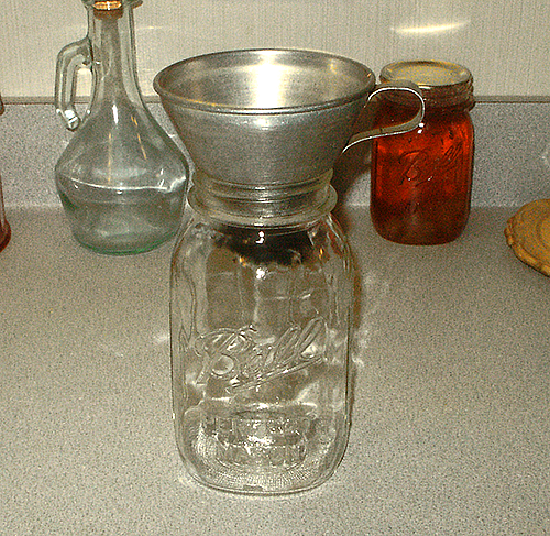 Before filling the jars, you need to sterilise them in a pot of boiling water. You also need to sterilise the lid before placing it onto the rim of the jar; the bands do not need to be sterilise. To make the task of filling the jars easier, you will want to use a funnel that is designed to fit the mouth of the jar you are using; jars come in standard width mouth or wide mouth. The wide mouth jars are nice for bottling tomatoes and other vegetables that you want to preserve whole. Don't fill the jar completely to the top, you need to leave a headspace. I fill my jars to the bottom of the top section containing the screw threads for the bands. Tighten the band down snugly, but don't over tighten as you may find it difficult to remove the band later. Allow the jars to cool overnight before trying to remove the bands. You can date your jars by writing directly on the lid with a permanent marker.