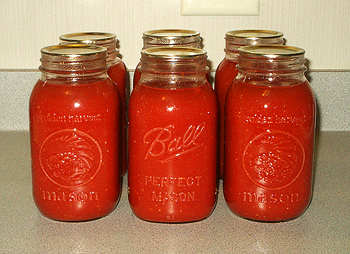 I do not process the jars in a pressure bottler since the tomatoes are a high acid food. However, here in the states the United States Department of Agriculture Extension Service recommends pressure processing the jars for twenty minutes at six psi. Since I cook my tomato juice for a longer period of time, and with the high acid content of the tomatoes, I have not found a need to pressure process the jars, and Mum never pressure processed her juice either. I do want to note that I am not recommending any particular way of processing tomato juice, I am simply writing about my own method of making and bottling tomato juice. If you are uncertain, I recommend that you follow the USDA Extension Services and pressure bottle your juice.