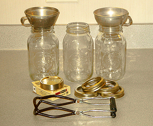 The jars used in pressure bottling are Kilner jars, also known as Mason jars in the US. These jars use a two piece top consisting of a metal lid with built in rubber seal and a metal screw band to hold the lid in place during the pressure bottling. Along with the jars you will need a metal funnel and a jar lifter for removing the hot jars from the bottler. You will need to sterilise the jars and lids using boiling water before you fill the jars. Before sterilising the jars, wash them in hot water using a liberal amount of washing up liquid.