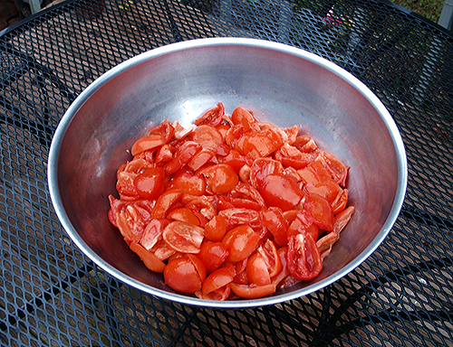 I prefer to use Roma tomatoes for my salsa because Romas are meatier and contain less liquid; however, one can use any variety of tomatoes. I do not peel the tomatoes before I purée them. There really is no need to go to the trouble of removing the peel, when you purée the tomatoes the peel will disappear into the purée and you will never know they are in there. Plus, the peelings of tomatoes contain a lot of the lycopene. I remove the stem end of the tomatoes and cut them in half. I also remove and discard the jelly seed mass of the tomatoes. Once I had the tomatoes sliced, and the seeds removed, I used my Prestigetm food processor to purée the tomatoes.
