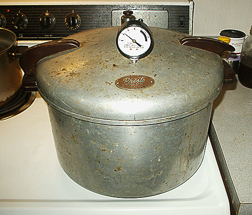 Once the pressure bottler is full, place the lid in place and make sure it is in the lock position; follow the instructions for your particular pressure bottler. Turn the burner on high and allow the water in the pressure bottler to come to a full steam. Let the pressure bottler vent for about 10 minutes to make sure the bottler is full of steam. I watch for a steady constant full vent of steam for several minutes but I caution my readers to follow the instructions that come with their particular bottler. I normally observe a pressure rise of about 1 or 2 psi, which means the steam is above 100 °C plus it is under pressure. When you are venting a steady steam for the recommended amount of time, using an oven mitt quickly close the vent, or place the vent cap into position.