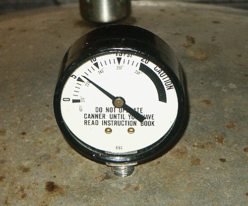 In the photograph above you can see some of the equipment needed in home bottling. The jars used are glass Kilner jars; also known as Mason jars in the US, and have a two piece top with a lid and a screw band. You can see the lids and bands in front of the jars. To fill the jars you will need a metal funnel designed to fit the mouth of the jar. If you are using wide mouth jars you can use a narrow funnel, but it will be easier to have a wide mouth funnel as well. Almost all of my bottling is done with the regular mouth jars, but if you plan on bottling whole fruits, such as tomatoes, the wide mouth jars are better as they allow the fruit to fit through the mouth of the jar easier. The utensil in front is a jar lifter. It is used to remove the hot jars from the pressure bottler after you allow the pressure to drop to zero. My pressure bottler is a 15 litre bottler. If you recall from your thermodynamics, at 6 psi with a constant volume the temperature will reach 110 °C (230 °F). Water at 1 atmosphere will boil at 100 °C so the temperature will increase 10 degrees over the normal boiling temperature of water.