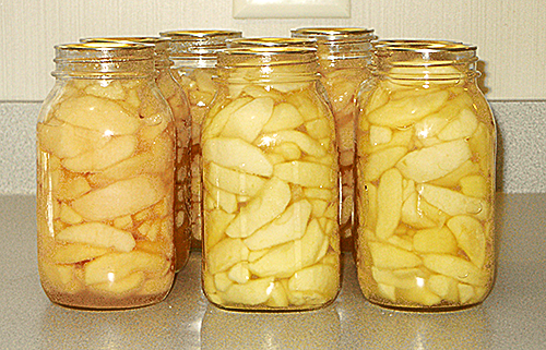Before filling the jars, place about 2.5 to 5 cm of water in the bottom of your pressure bottler and allow the water to come to a simmer. This will prevent the hot jars from cracking as you place them in the pressure bottler. As you place the apples in the jars, shake the jars to settle the apples. You can also use a sterilised spoon to help settle the apple slices, but avoid crushing the apples. When the jar is full, leaving a head space of about 1.3 cm (I fill the jars to the bottom of the jar threads where the band will end as a rough guide and I have never had any problems), add the syrup making sure no air bubbles are trapped between the apple slices. Carefully give the jar a bit of a shake to help the air bubbles to rise to the top. Place a sterilised lid in place, and screw the band down snugly. It is important to have the lid on snugly. I lost almost all the syrup in one jar during processing as the lid was not on securely enough; the syrup boiled out of the jar. Place the filled jar in the pressure bottler and repeat for the next jar. My bottler is a 15 litre and will hold seven US quarts.